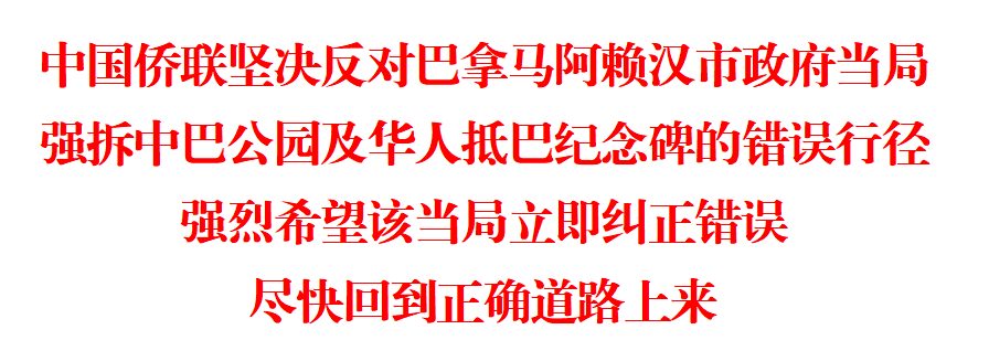 巴拿马当地时间12月27日深夜,阿赖汉市政府当局不顾现场华侨华人代表的一致反对,悍然强行拆除了位于美洲大桥观景台的、铭记华人对巴百年贡献和象征中巴人民友谊的中巴公园及华人抵巴150周年纪念碑。对此,12月29日上午,中国驻巴拿马大使馆发布严正声明,表示极度震惊、强烈愤慨和坚决反对;中国外交部发言人当日下午郑重表示,中方对巴拿马有关地方政府强拆华人抵巴纪念碑行径严重不满,已向巴方提出严正交涉。中国侨联完全同意、坚定支持上述表态。